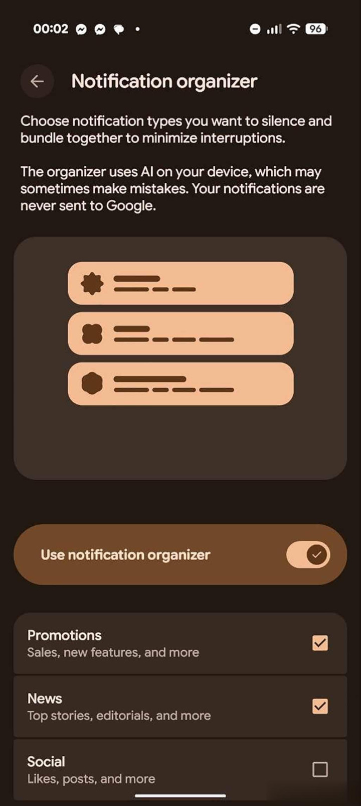技术上,该功能依赖Android System Intelligence应用的AI服务,利用本地神经网络处理文本和上下文,避免云端传输以保障隐私。用户可在设置中选择“始终展开组”模式,实时追踪分类结果,或针对特定应用豁免整理以防遗漏关键警报。测试显示,在高频通知场景下,如社交应用峰值期,它可将警报数量压缩30%,提升响应效率。
